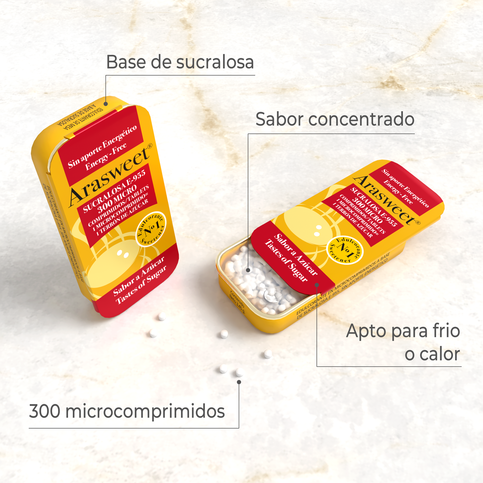 Microcomprimidos para añadir a tus bebidas o alimentos para darles un toque extra de dulzor. Con una formulación avanzada basada en sucralosa, Arasweet® ofrece un gusto agradable.