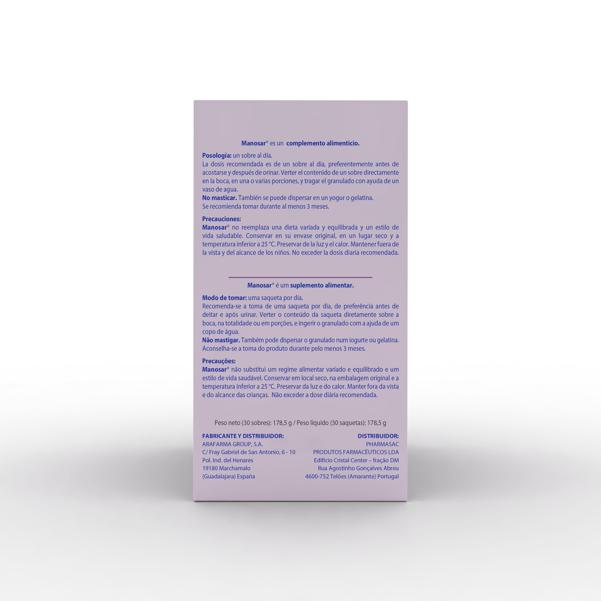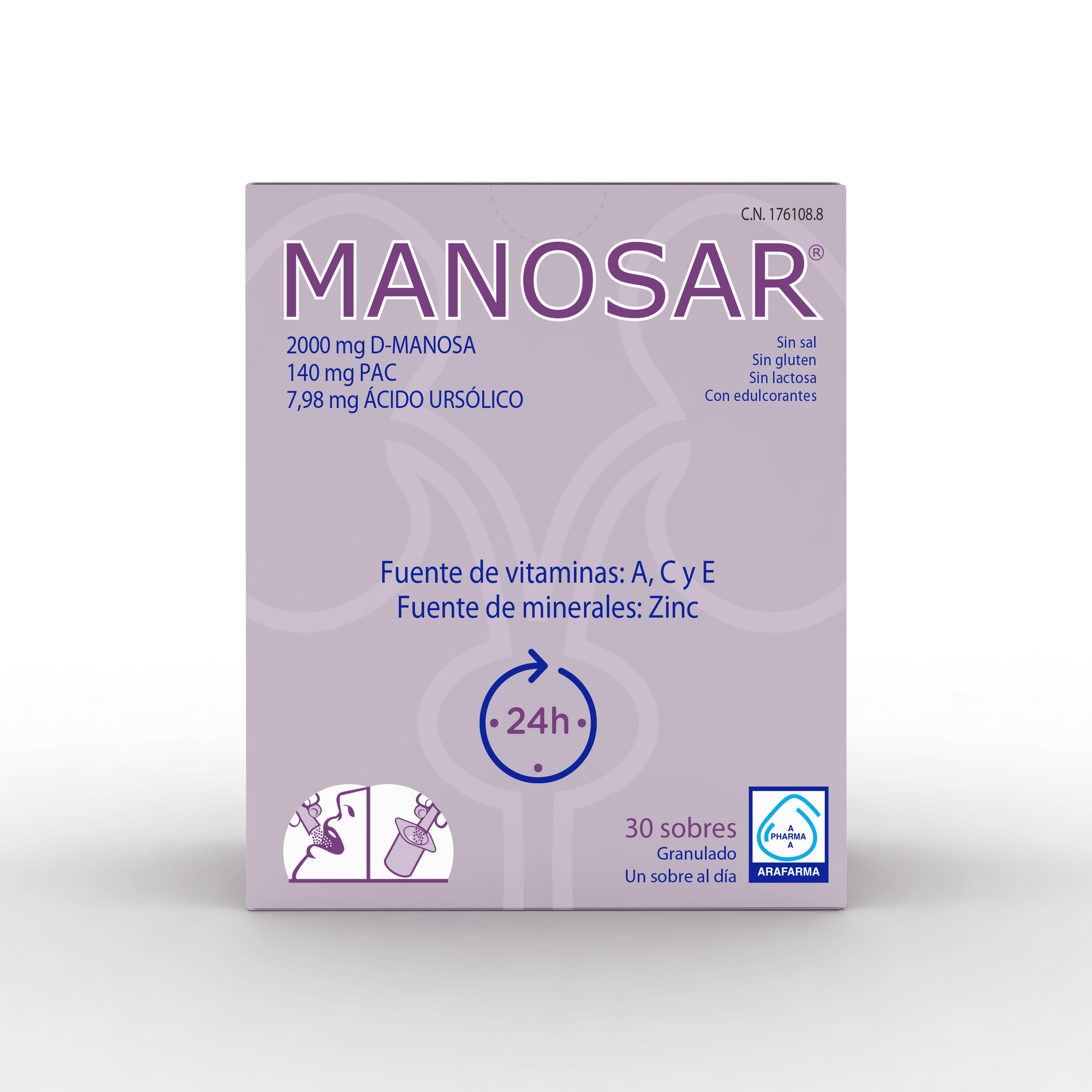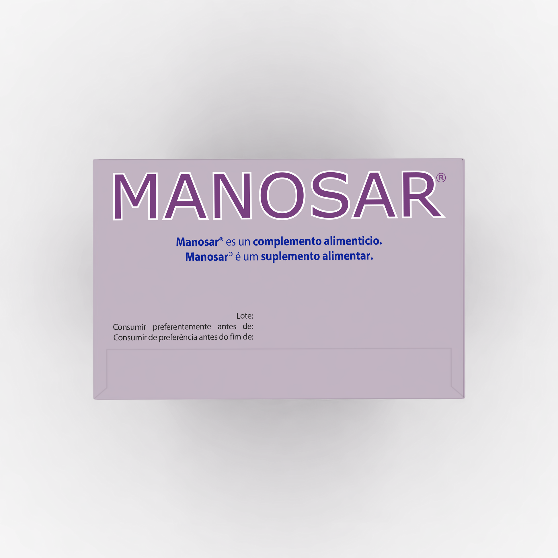 Manosar contiene D-Manosa en forma de liberación prolongada, lo que se ha demostrado que previene la adhesión de las bacterias de E.coli al urotelio por el bloqueo de las fimbrias tipo I favoreciendo su eliminación a través de la orina.